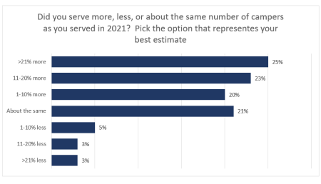 We started out by asking about how many unique campers were served in summer 2022, to which the most common response was more than 1,000 unique campers. Then we asked whether camps served, more, less, or about the same number of campers in 2022 compared to 2021. Looking at the figure below, which shows the results of this question, you can see that more than half of the camps responding to this survey reported serving more campers in 2022 than 2021.