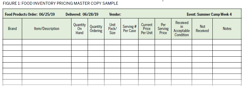 Next, I suggest creating a multifunction spreadsheet as a tool for tracking food cost, a weekly inventory, order, and product delivery confirmation form, along with columns for input regarding cost per case/unit, per portion cost (refer to the example in Figure 1 below). This multipurpose form will ensure you have all this valuable information in one place.