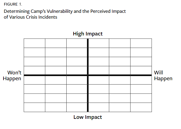Use the camp's risk profile to identify a starting point for the response team (see Figure 2, above). Specifically, items plotted in the upper-right quadrant are most likely to occur and would have high impact, so these incidents get priority attention. Second-level attention should be paid to events in the upper-left and lower-right quadrants, with the lower-left quadrant getting low attention. That being said, a word of caution is in order: items in the lower-left quadrant have a low chance of happening but also carry the potential for catastrophe should they occur. That means adjusting your potentials as best for your camp.