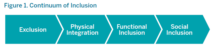 The continuum of inclusion begins at the physical integration level, where campers with disabilities are present and participating alongside their peers at a basic level in the environment. The next major step on this continuum is that of functional inclusion. At the functional inclusion level, campers are functioning in the environment and receiving similar enjoyment and success as campers without disabilities, but typically lack meaningful and ongoing social interactions with their peers. The ultimate goal on the continuum is to reach level three; that is, social inclusion, where participants are fully included, accepted, and supported by their peers (rather than by paid staff), and are developing friendships with them.